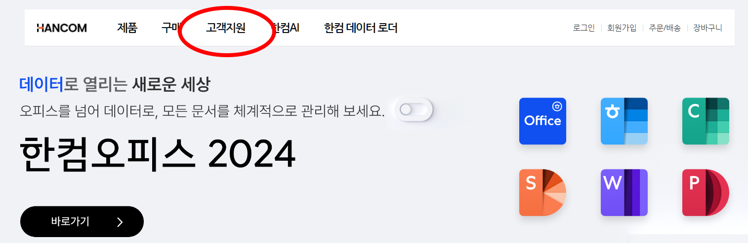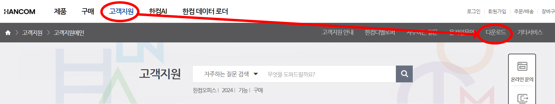 한컴 홈페이지에서 일반적으로 페이지 상단이나 하단에 있는 '지원' 또는 '고객 지원' 섹션을 찾으세요. "다운로드" 또는 "다운로드"를 클릭하여 다운로드 센터로 이동합니다.